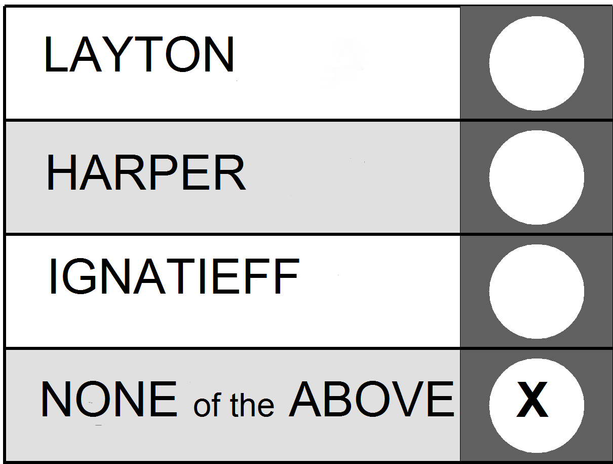 Whether offered the choice of Gaddafi, Hu Jintao, Ahmadinejad and ‘None of the Above’ OR Layton, Harper, Ignatieff and ‘None of the Above’, ‘None of the Above’ is the choice that reflects the reality that for the majority of Canadians none of the current choices, candidates or political parties represent the best interests, needs and thoughts of these Canadians.