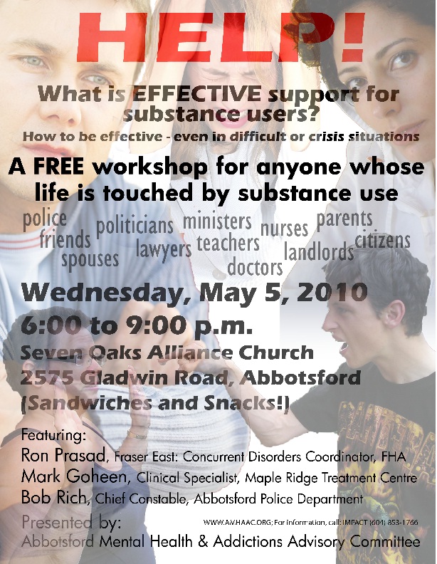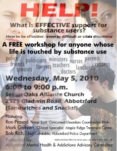 You want to be at Seven Oaks Alliance Church (2575 Gladwin Road Abbotsford) on Wednesday night (May 5, 2010) for the Workshop presented by the Abbotsford Mental Health and Addictions Advisory Committee on Substance Use and Users.