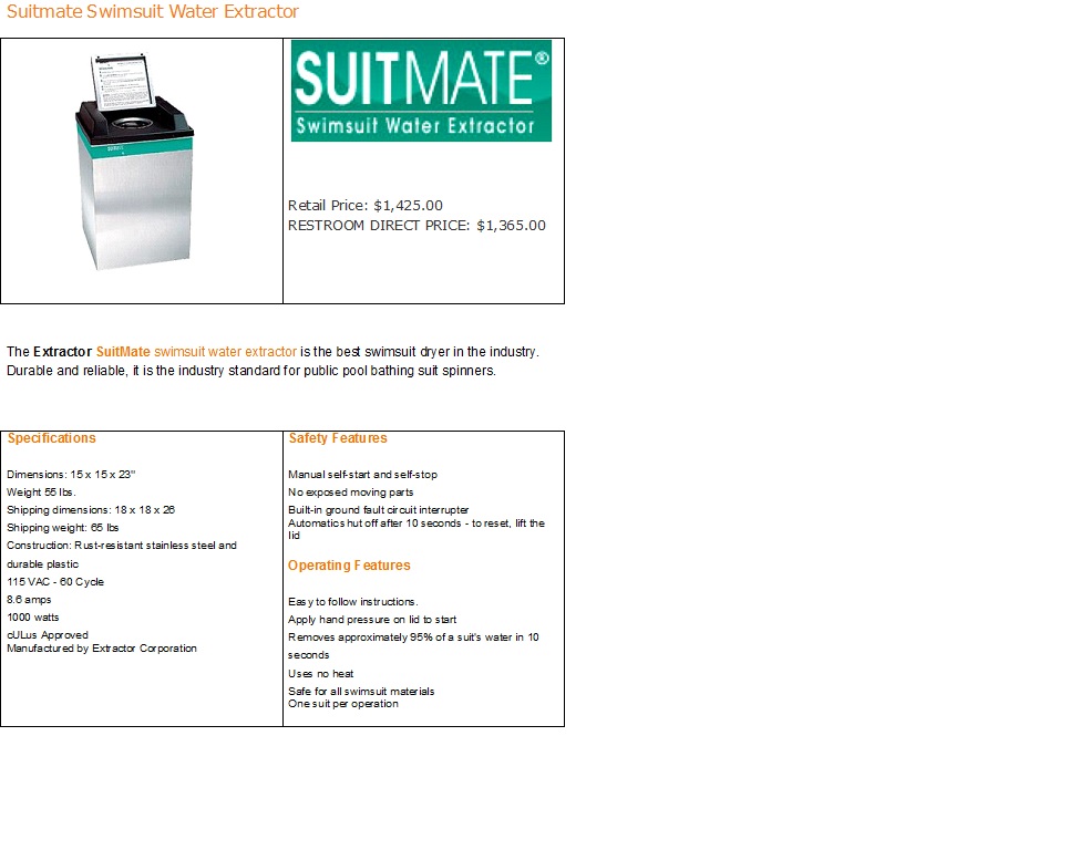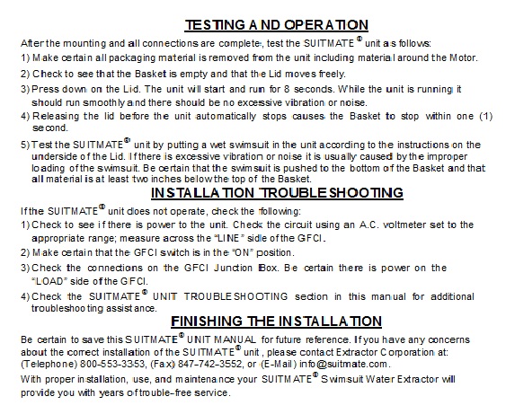 If these questions have not led to a satisfactory answer to the problem with the SUITMATE , please call the Extractor Corporation at ________. We want you and your patrons to have the benefits of a smoothly operating SUITMATE Swimsuit Water Extractor.