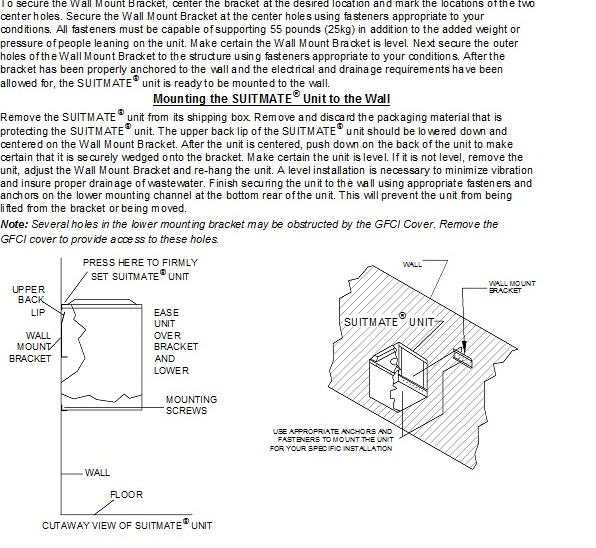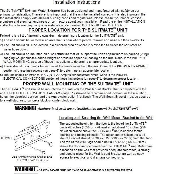 As to clients rough treatment of the Suitmate, the units are solidly constructed and research did not uncover patron use causing damage to the Suitmate elsewhere. Regarding concerns with how patrons use the Suitmate, the following is from the manufacturer’s installation instructions (Exhibit C).