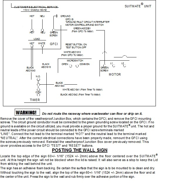 Locate the top edge of the sign 60+/- 1/16” (1524 +/- 2mm) above the floor centered over the SUITMATE® unit. At this height the sign will not be blocked when the lid is raised. It will also serve as a stop to keep the Lid from striking the wall behind the unit.