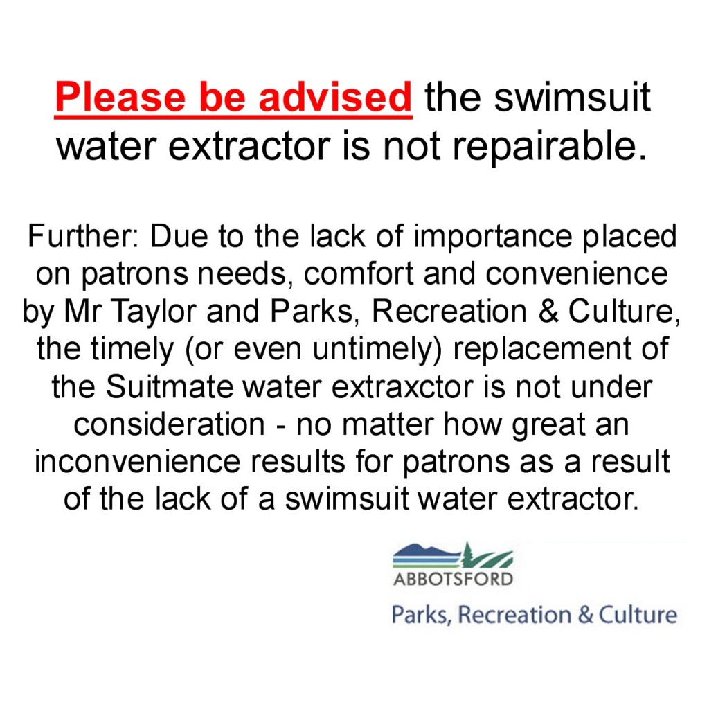 Regular use of recreational facilities in Abbotsford drives home the reality that there is a better chance that Hell will freeze over than Mark Taylor and Parks, Recreation & Culture will pay attention to patron feedback or the needs, comfort and convenience of patrons.