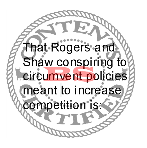 If the Conservative government acted with, or had, a crumb of the concern it lavishes on Big Business on behalf of ordinary Canadians……Shaw’s spectrum would be going to enhance and encourage competition in the wireless market instead of being snuck into the back pocket of one of those proscribed from purchasing it originally – an incumbent wireless provider.