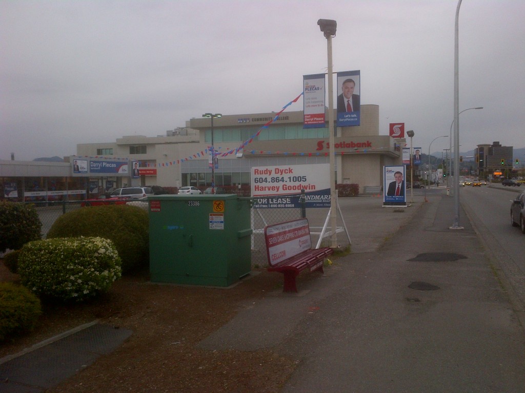 Walking along the street past Mr. Plecas’s election office one comes upon some elections signs in front of Envision Credit Union.