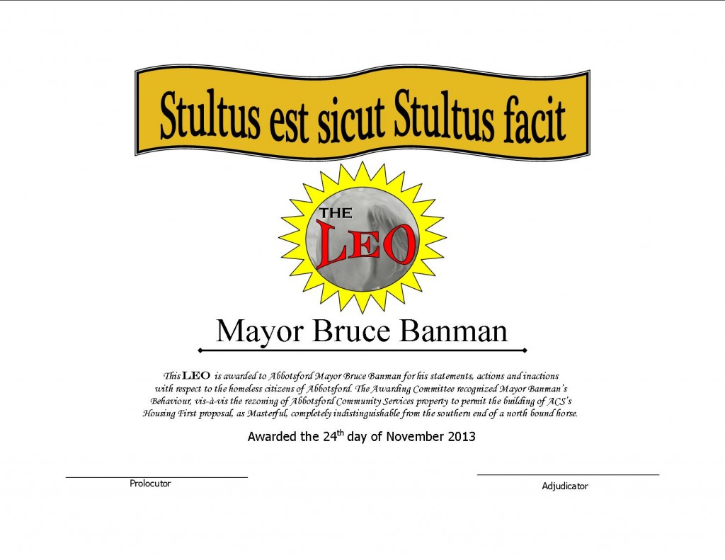 The Leo committee agreed with the nominators of Mayor Banman [The League of Unhoused Citizens of Abbotsford] that standing at the microphone at Cascade Church during the discussion held there on Abbotsford Community Services housing first proposal and crying how poor the city was and how it was up to senior levels of government to step forward with funding while, as pointed out by a citizen, to his immediate right were three representatives of BC Housing with $2,500,000 in capital costs and ongoing yearly funding for programs on the table that the Mayor is seeking to spurn.