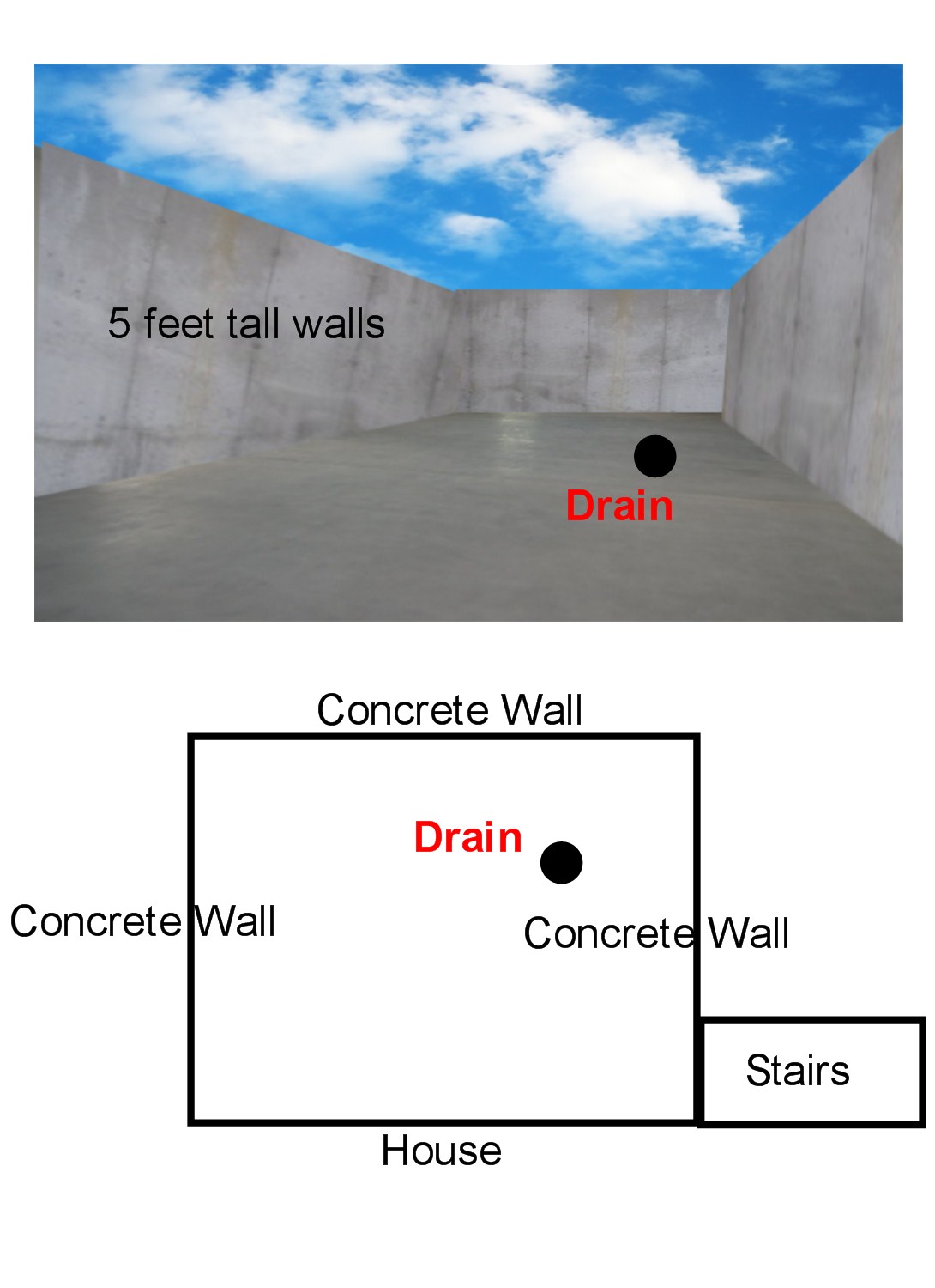 I live in a basement suite; the entrance is around back via stairs that take you down 5 feet below grade. As the diagram shows there are three five feet tall concrete walls with the fourth side being the wall of the house. As noted in the diagram there is a drain in the concrete floor of the ‘porch’.