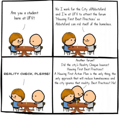 A forum on Housing First Best Practices, there is an oxymoron concept. Assuming one is speaking of the approach – Housing First – that has repeatedly demonstrated its ability to effectively reduce homelessness; and not speaking of the buzzword ‘housing first’ as usurped by Abbotsford’s mayor and council. The way the mayor et al toss ‘housing first’ around it is as though they believe using the invocation ‘housing first’ will somehow align the stars and planets and homelessness in Abbotsford will disappear without the need for sustained effort and tough choices.