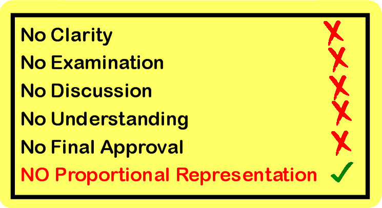 to the fact that, given the importance of this issue, the process is full of gaping holes; to the reckless haste; to ignoring addressing the fact that what is proposed is a change from the method used in Canada to choose governments and elect politicians since Confederation; to the lack of language clearly setting out what the choices entail and the exact meaning of the choices; to politicians writing the rules for the method by which they [politicians] are elected; to the ignoring of the tactical advantage the proposed change confers on the NDP/Green collaborators in holding onto being the government, political power and power; to ignoring the effects, consequences and costs of the proposed change; to the lack of oversight and input by citizens on electoral change; to the lack of adequate adult supervision of the politicians and process; to the fact the final legislation does not require the approval of citizens to make the most significant change to BC’s electoral system since BC became a Canadian province the law; to the fact that such a significant change should require a minimum of 80% support to become law; to the apparent stealth being employed to slip a complete change to the electoral system past citizens; to the total lack of thought, research/exploration and understanding as to the magnitude of the change, the effects, consequences and costs of the proposed change…….