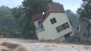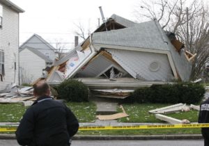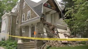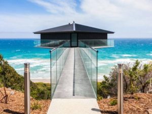 Perhaps the ocean had undermined a bluff leaving a house hanging by its walkway?