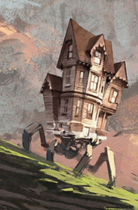 A train of thought that brings to mind a mental image of a house setting off to explore the World.